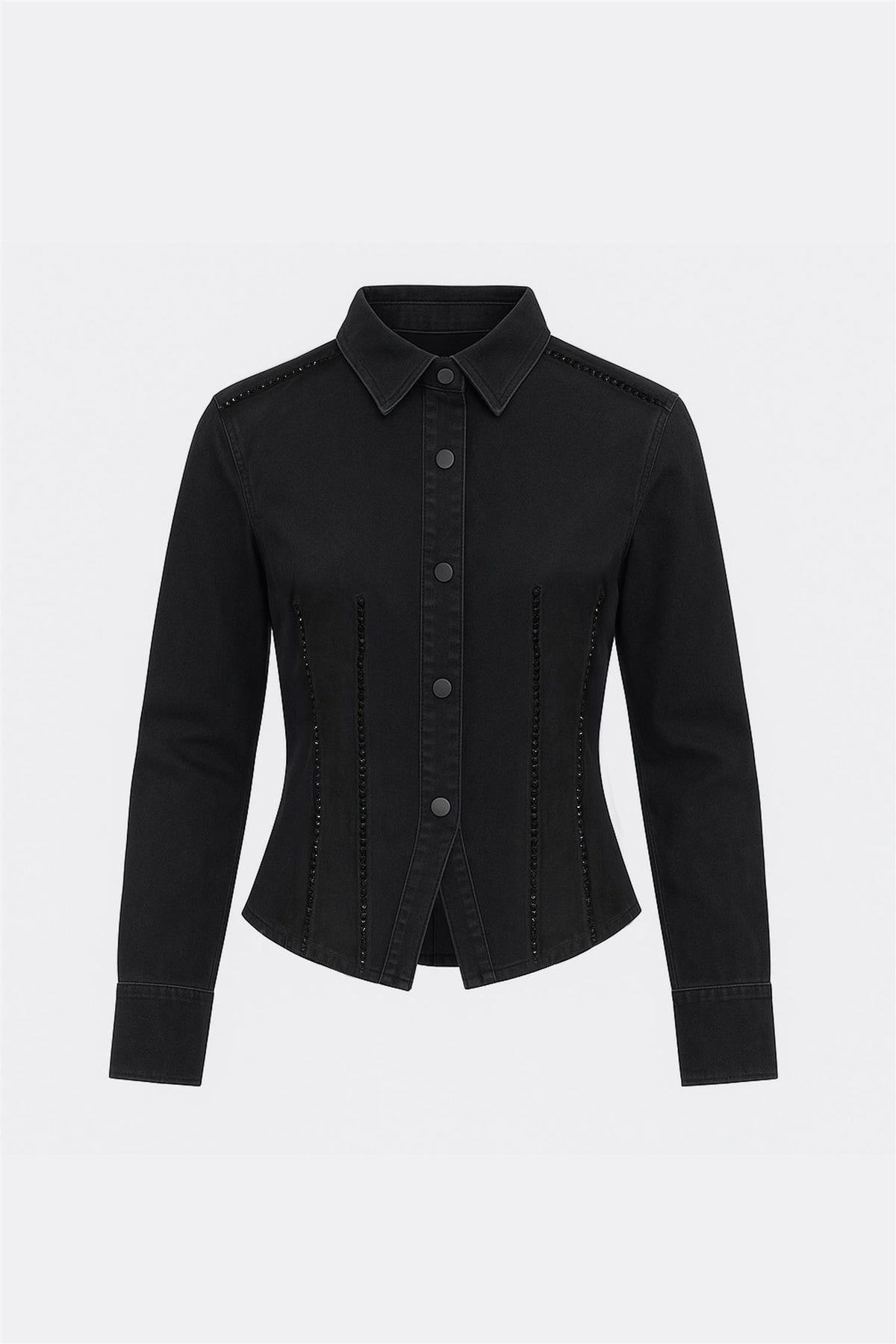 Elegant denimskjorte med krage og knappestolpe foran, utsmykket med delikate detaljer for et sofistikert uttrykk. Designet med paneler og innsnitt som fremhever midjen og gir en formsydd, feminin silhuett.