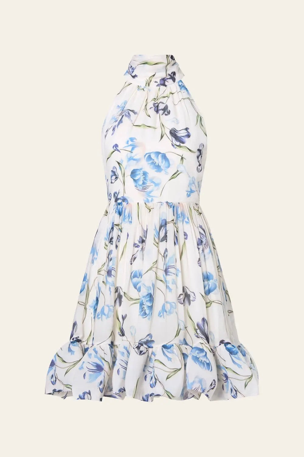 Fern Halterneck Ruffled Mini Dress fra Malina er en feminin og elegant sommerkjole med åpen rygg og halterneck-design.