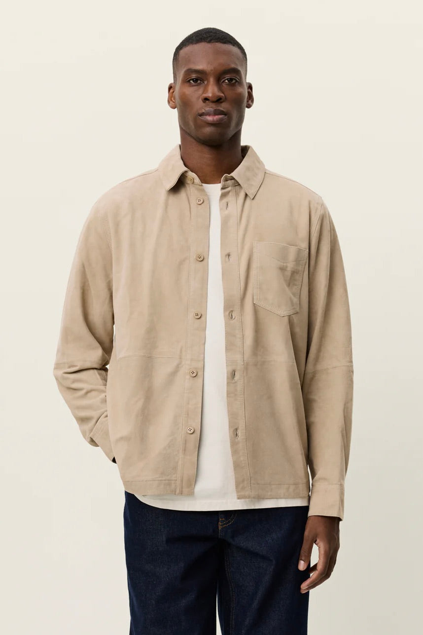 En tidløs Overshirt i mykt semsket skinn fullført i et rent, klassisk design. Skjorten har én praktisk brystlomme, skarp krage og justerbare mansjetter, som gjør den perfekt for lag-på-lag-styling.