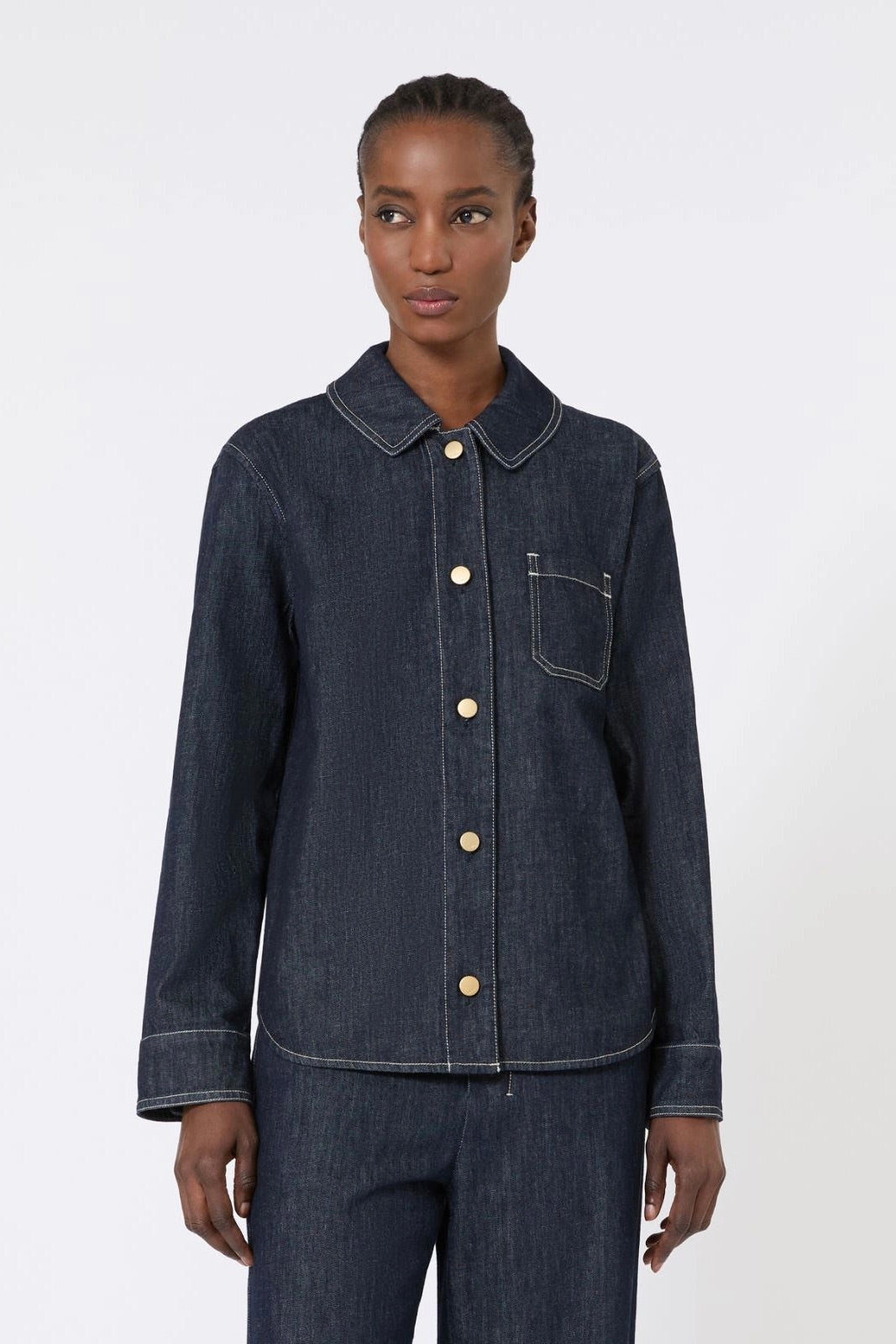 Skjorte i ren bomullsdenim, farget for hånd i dyp indigo for et unikt og levende uttrykk. Skjorten har klassisk krage, doble mansjetter og lange innføyde ermer, kombinert med en funksjonell brystlomme på venstre side. Gullfargede knapper i front og kontrastfarget ecru-søm fremhever detaljene, mens den spesialdesignede jacquard-labelen under kragen gir et eksklusivt preg.