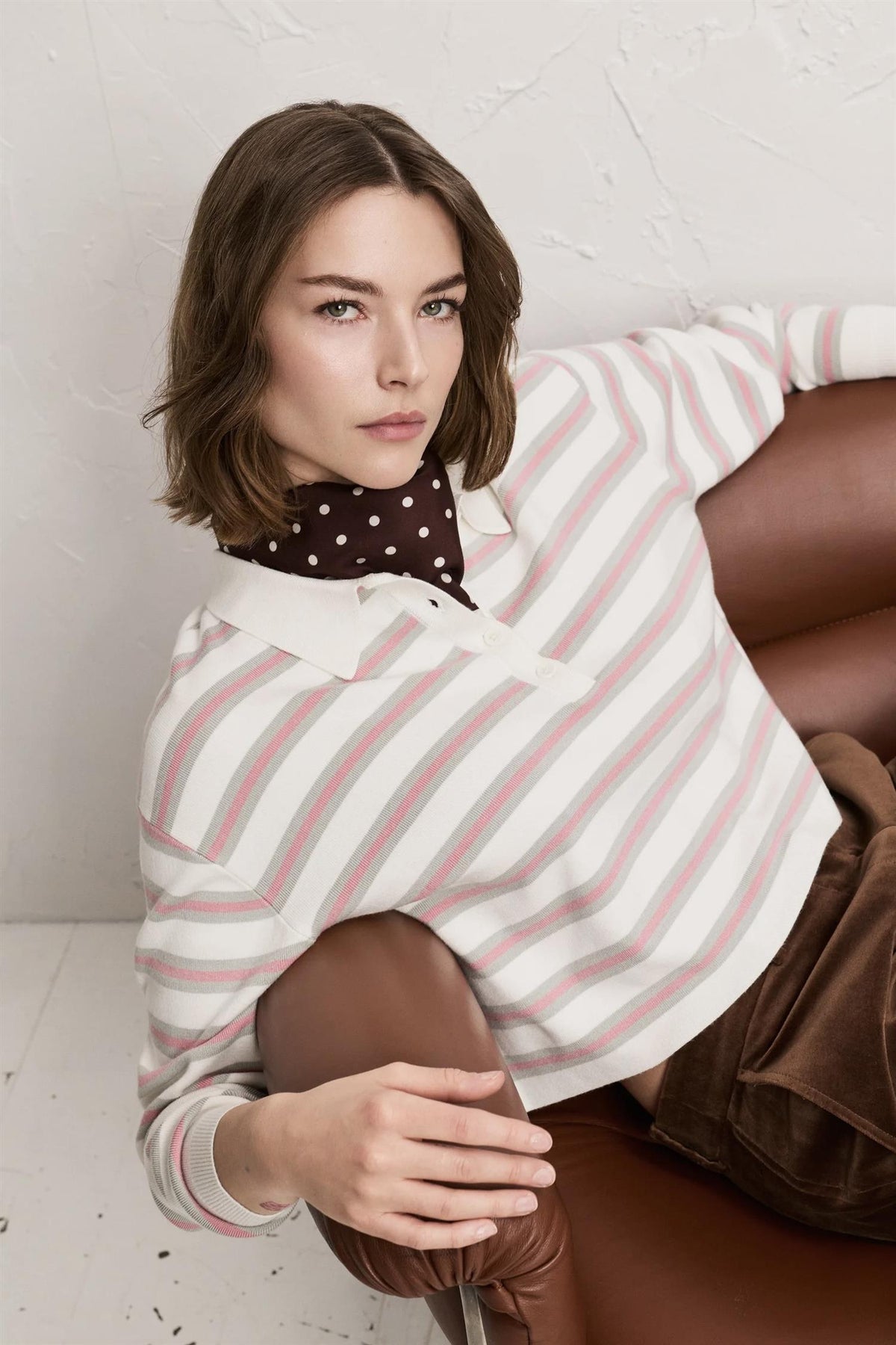 Skalet er laget i 100 % silke, noe som gir en luksuriøs følelse, et lett fall og en vakker glans. Den varme brune fargen kombinert med klassiske prikker skaper et sofistikert og stilrent uttrykk.