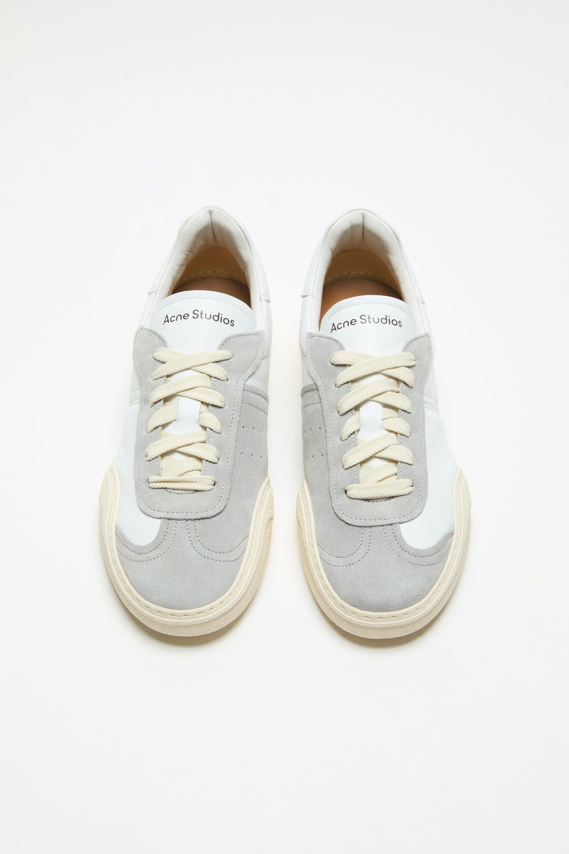 Snøresneakers med et minimalistisk design, laget av skinn og semsket skinn. Dekorert med svart logo på tungen.