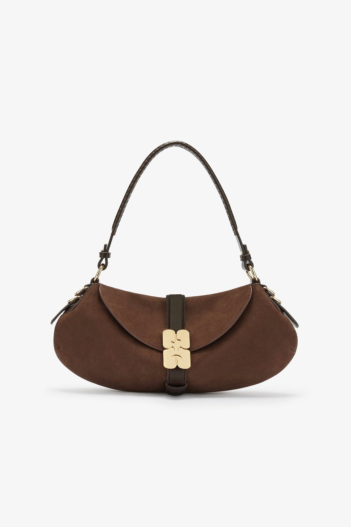 Denne vesken kombinerer en moderne, buet silhuett med funksjonelle detaljer og GANNIs ikoniske signatur. Klafflukkingen prydes av den karakteristiske «Butterfly»-logoen, som gir et lekent og gjenkjennelig uttrykk. Den justerbare skulderstroppen gjør den enkel å bære, enten til hverdags eller ved spesielle anledninger.