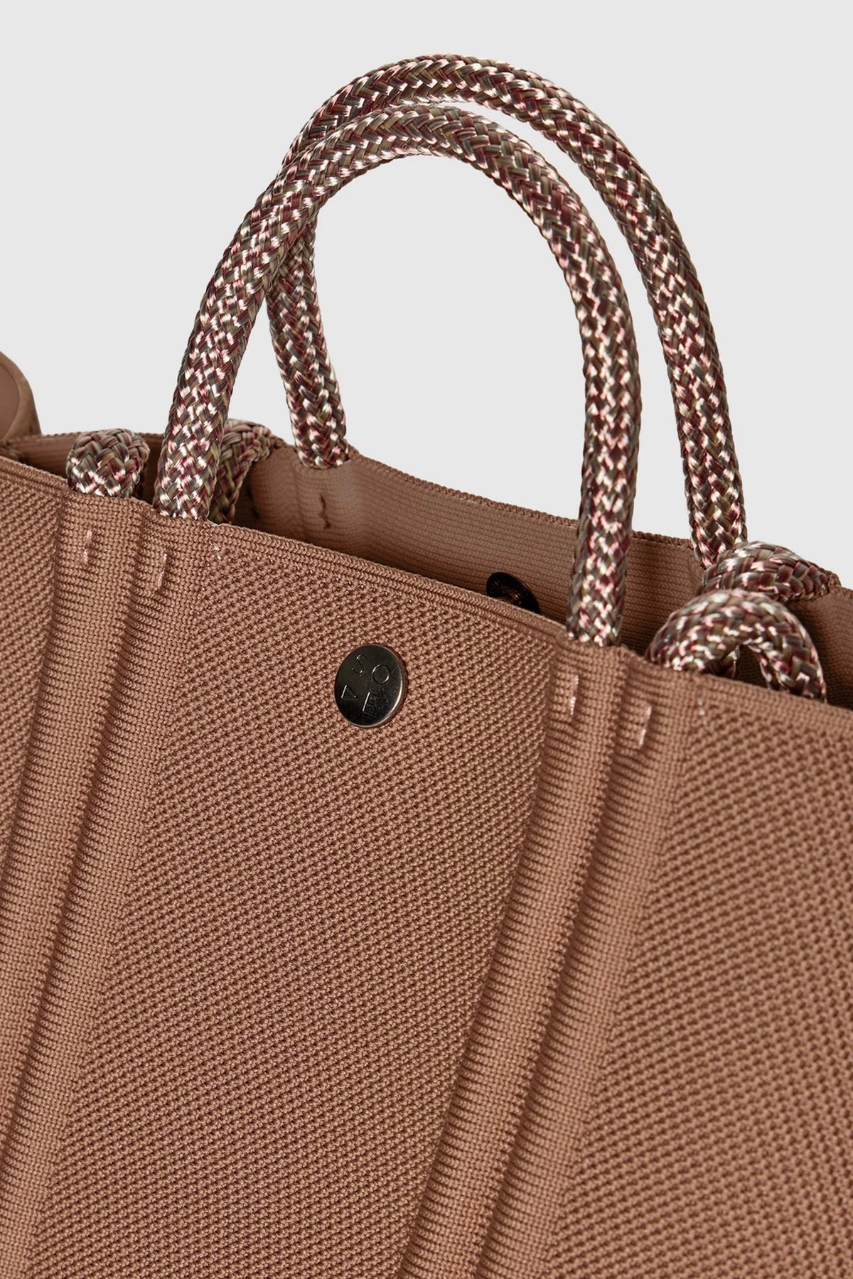 Den strukturerte, strikkede overflaten gir et eksklusivt uttrykk, mens de karakteristiske tauhåndtakene er integrert i designet gjennom strikkede kanaler som både former vesken og gir ekstra slitestyrke.