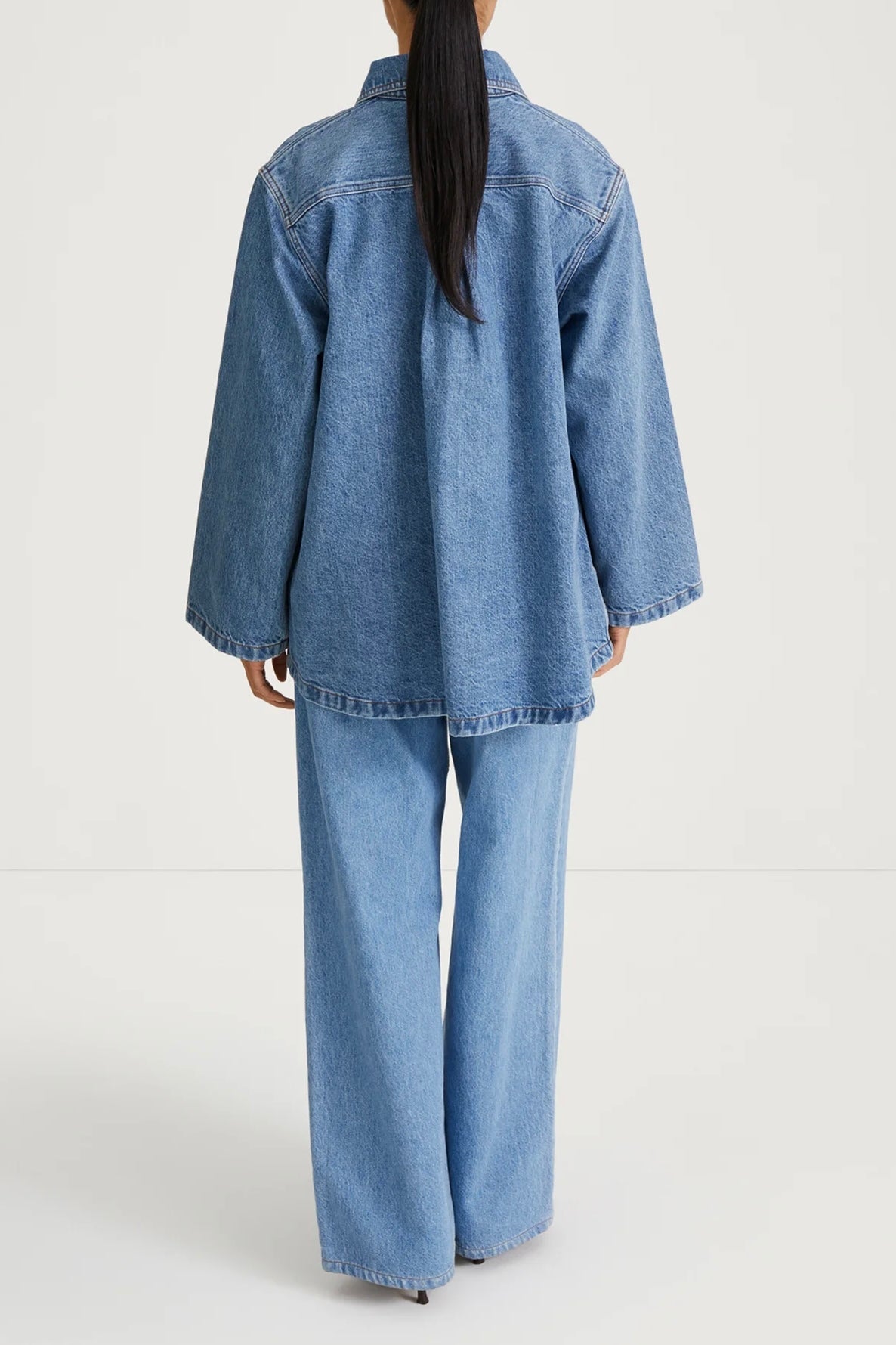 Karen Denim Jacket fra Stylein er en lett utsvinget jakke laget av denimstoff, med Styleins karakteristiske boksfold i ryggen.