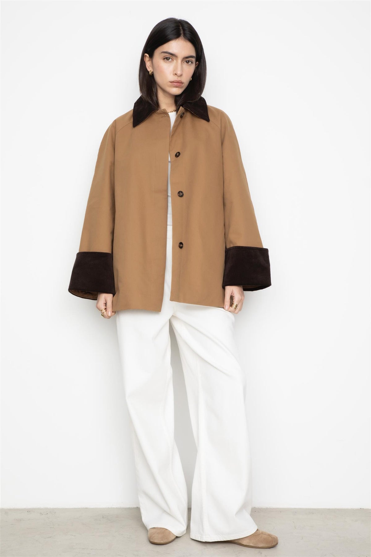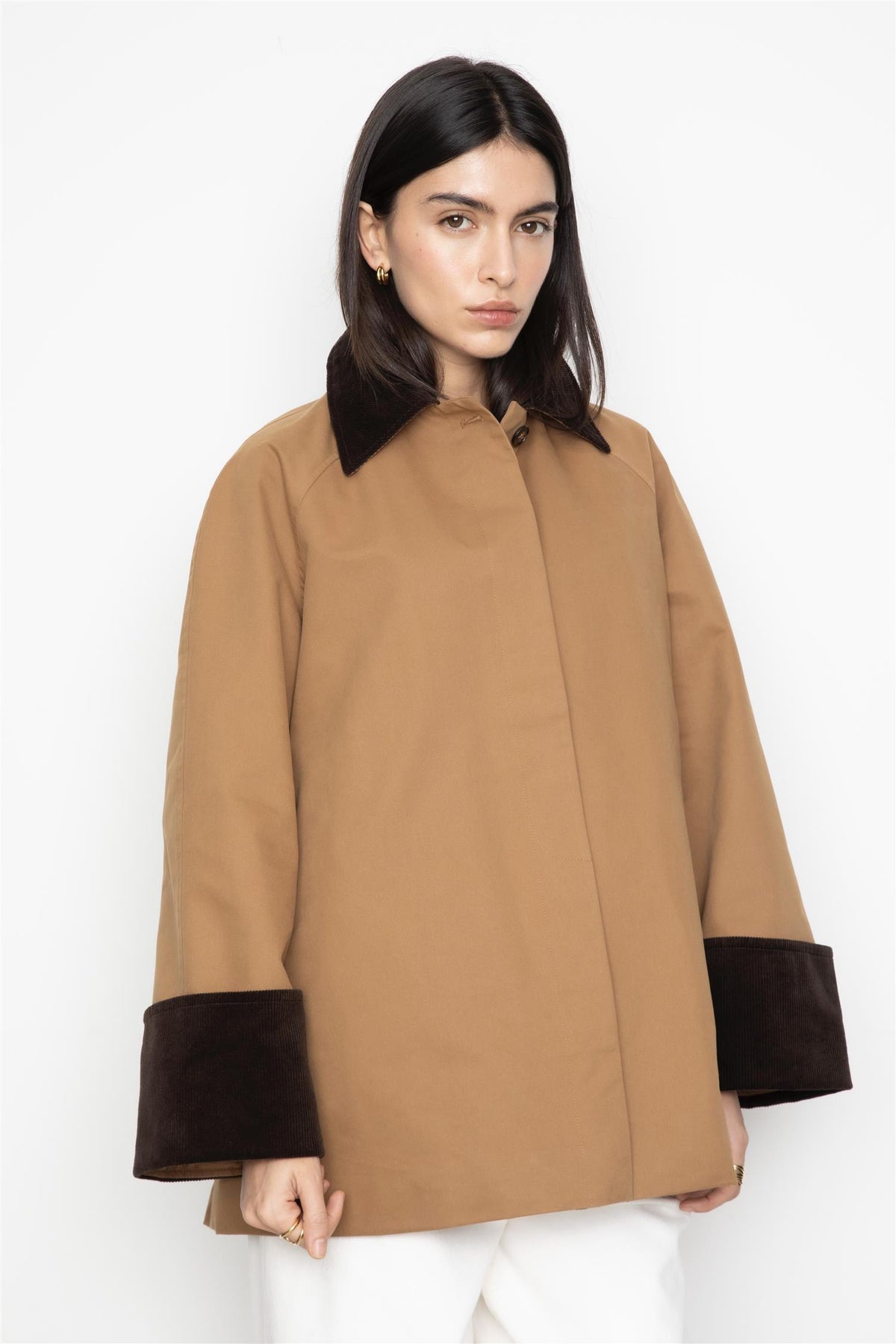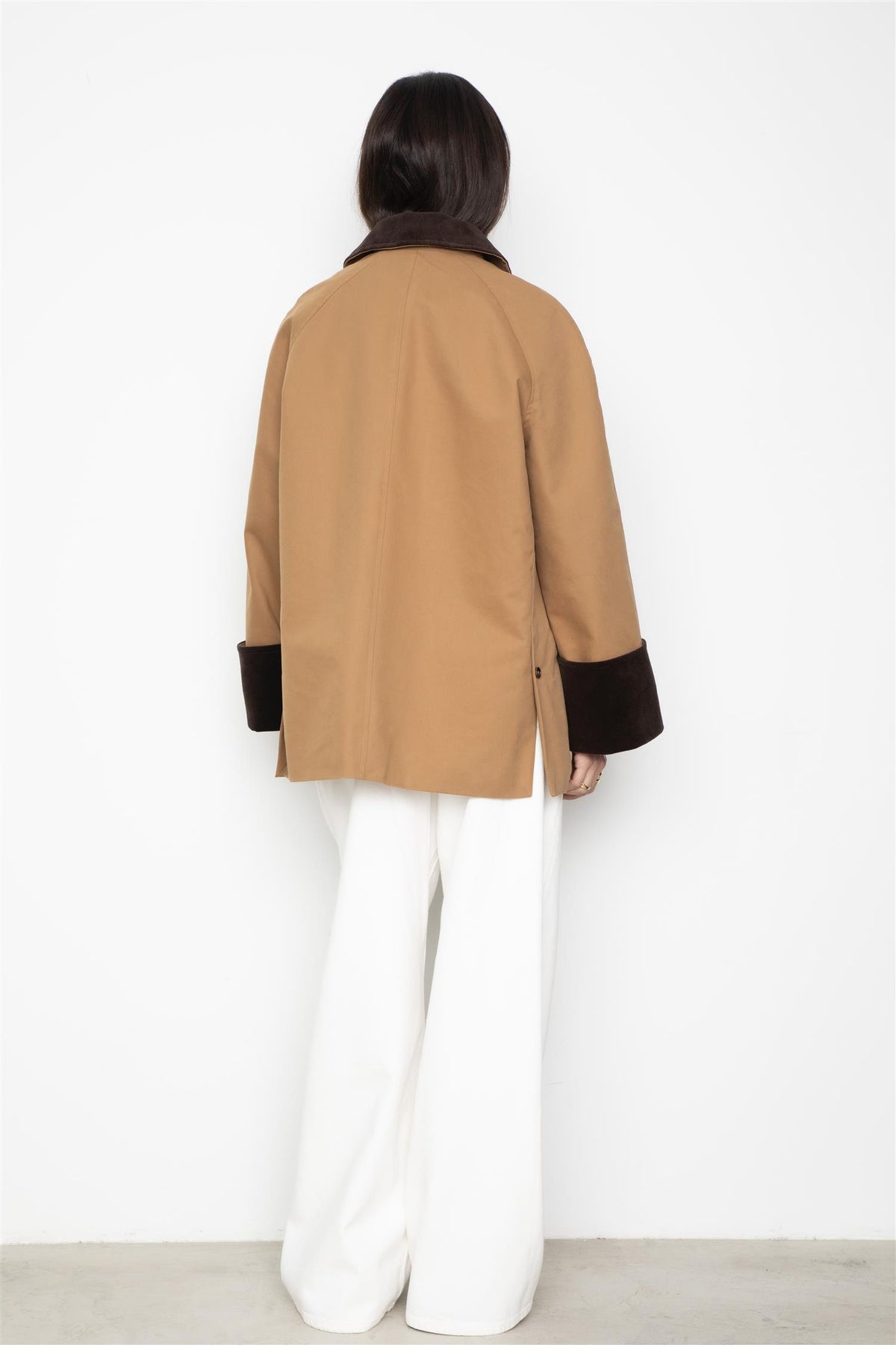 Jakken har en avslappet passform med raglan-ermer og lett polstret fôr for ekstra komfort. Den har mørk brun cordfløyelskrage og -mansjetter, skjult knappelukking foran, og høye sidesplitter bak som gir bevegelsesfrihet og et moderne preg. Et praktisk og stilfullt ytterplagg for daglig bruk.