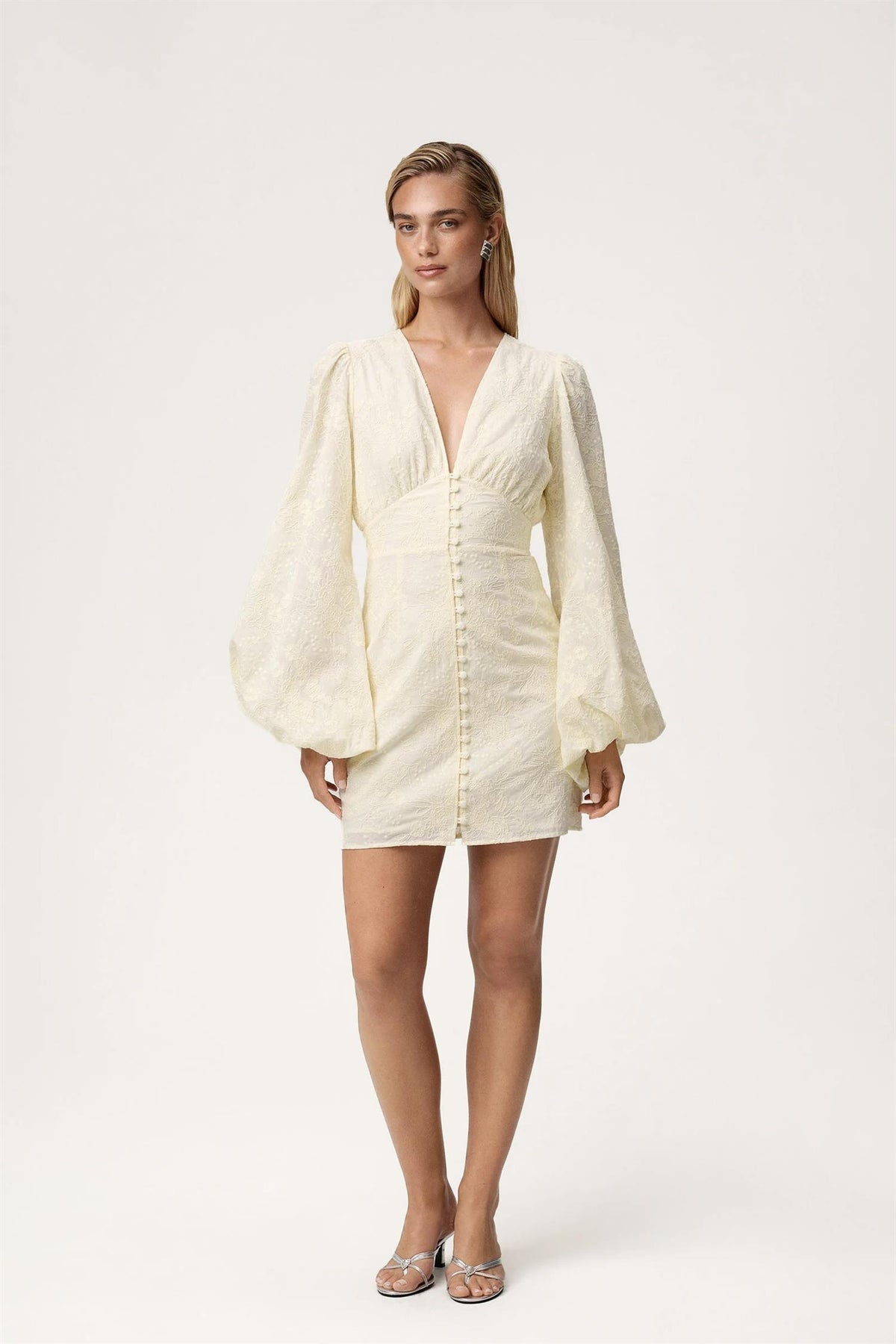 Florence Mini Dress fra Adoore er en feminin og sommerlig minikjole i en delikat lys gulfarge. Kjolen har V-utringning, voluminøse ermer og knapper langs fronten som gir et romantisk og sofistikert preg. Skjult glidelås bak gjør kjolen enkel å ta av og på, mens minilengden gir et lekent og moderne uttrykk.