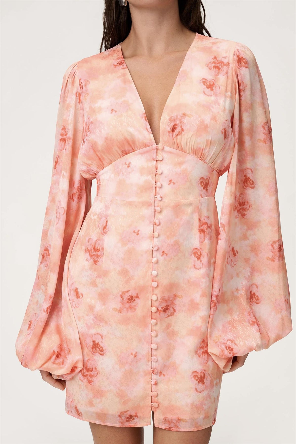 Florence Mini Dress fra Adoore er en feminin og sommerlig minikjole med et delikat peach-farget blomsterprint. Kjolen har V-utringning, voluminøse ermer og knapper langs fronten som gir et romantisk og sofistikert preg. Skjult glidelås bak gjør kjolen enkel å ta av og på, mens minilengden gir et lekent og moderne uttrykk.