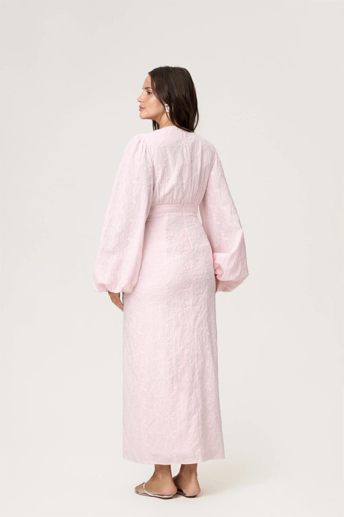 Positano Maxi Dress fra Adoore er en elegant og feminin maxikjole med delikat rosa broderi som gir et romantisk og sofistikert preg. Kjolen har V-utringning med krage, dristige lange ermer, og knapper med splitt foran som skaper et moderne og lekkert uttrykk. Kjolens kropp er helfôret for komfort og struktur, og en skjult glidelås bak sørger for en pen og enkel lukking.