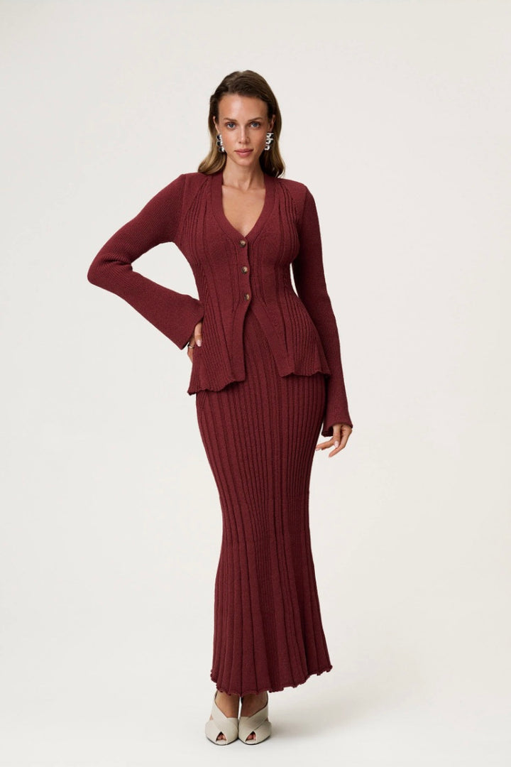 Lugo Cardigan fra Adoore er en elegant cardigan designet med strukturerte skulderputer og en definert midje som gir en slankere silhuett.