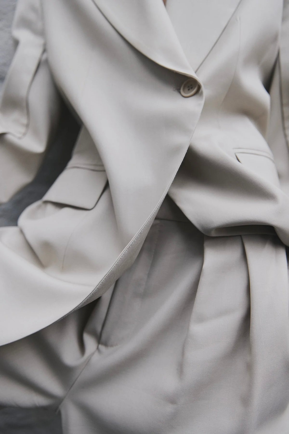 En skarp og sofistikert blazer med asymmetrisk snitt som løfter både hverdagsantrekk og mer formelle looks. Den skreddersydde silhuetten kombinerer moderne design med tidløs eleganse, og gjør den til et nøkkelplagg i en stilbevisst garderobe.