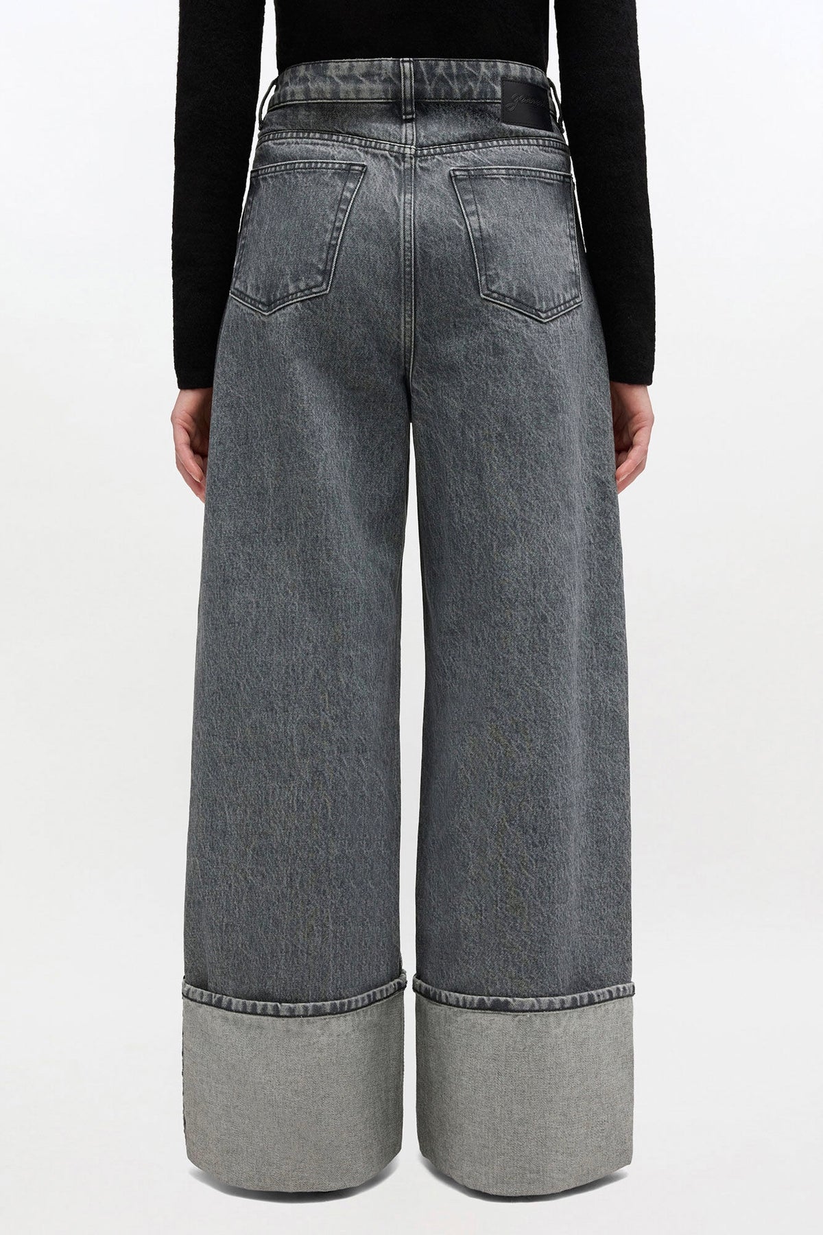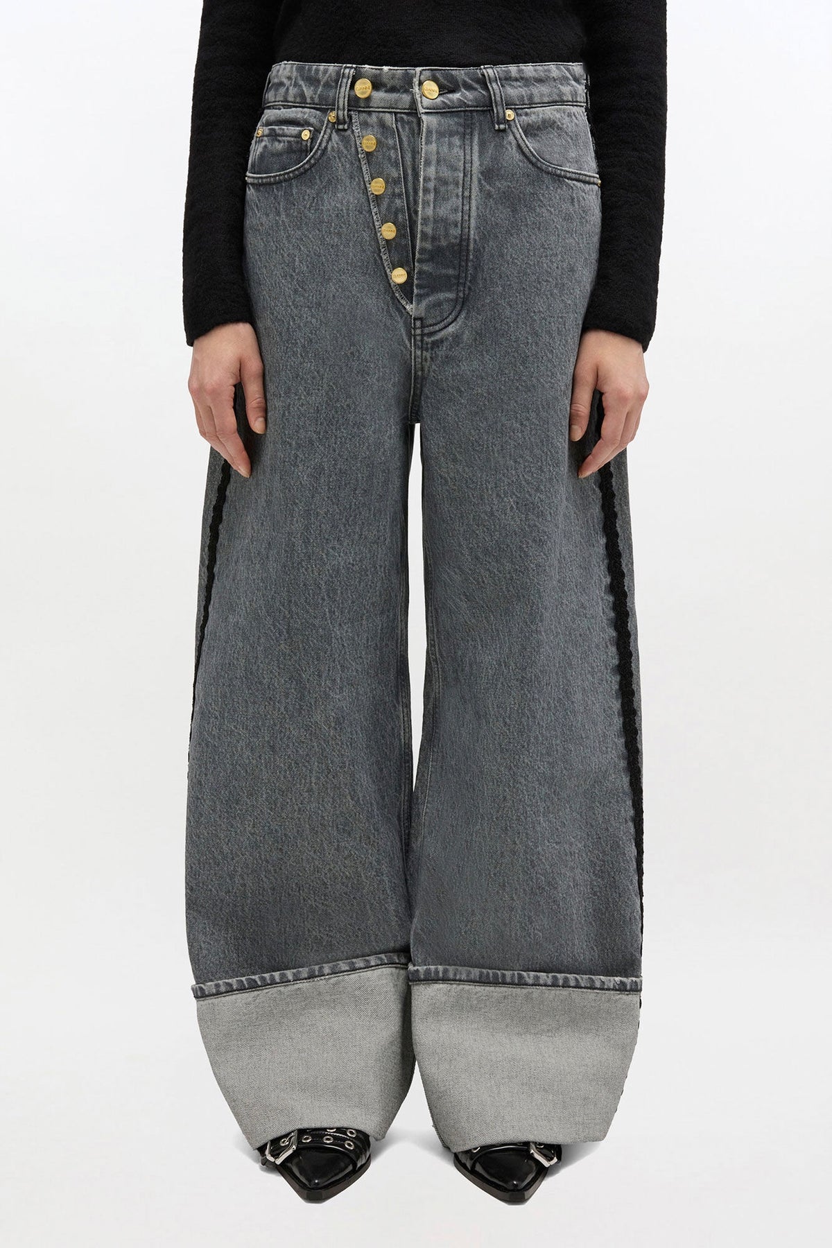 Den doble knappelukkingen gjør det mulig å bruke dem både som mid-rise og low-rise. Jeansene er laget i stiv, økologisk bomull med en gråvasket finish og dekorative blondesøm-detaljer.