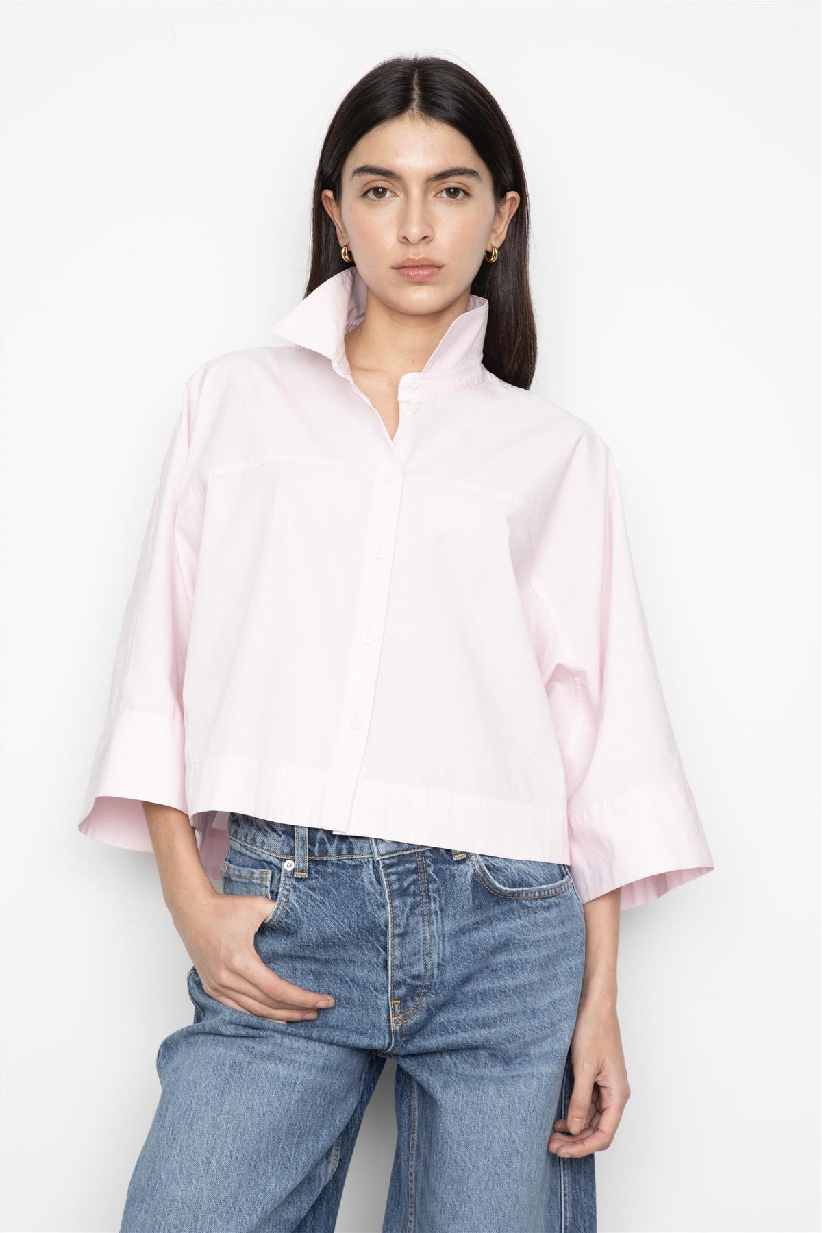 Skjorten har en ledig passform og en lett croppet lengde, noe som skaper en avslappet, men gjennomført silhuett. Den delikate lyserosa fargen tilfører garderoben et feminint og friskt innslag, perfekt for både vår- og sommersesongen.