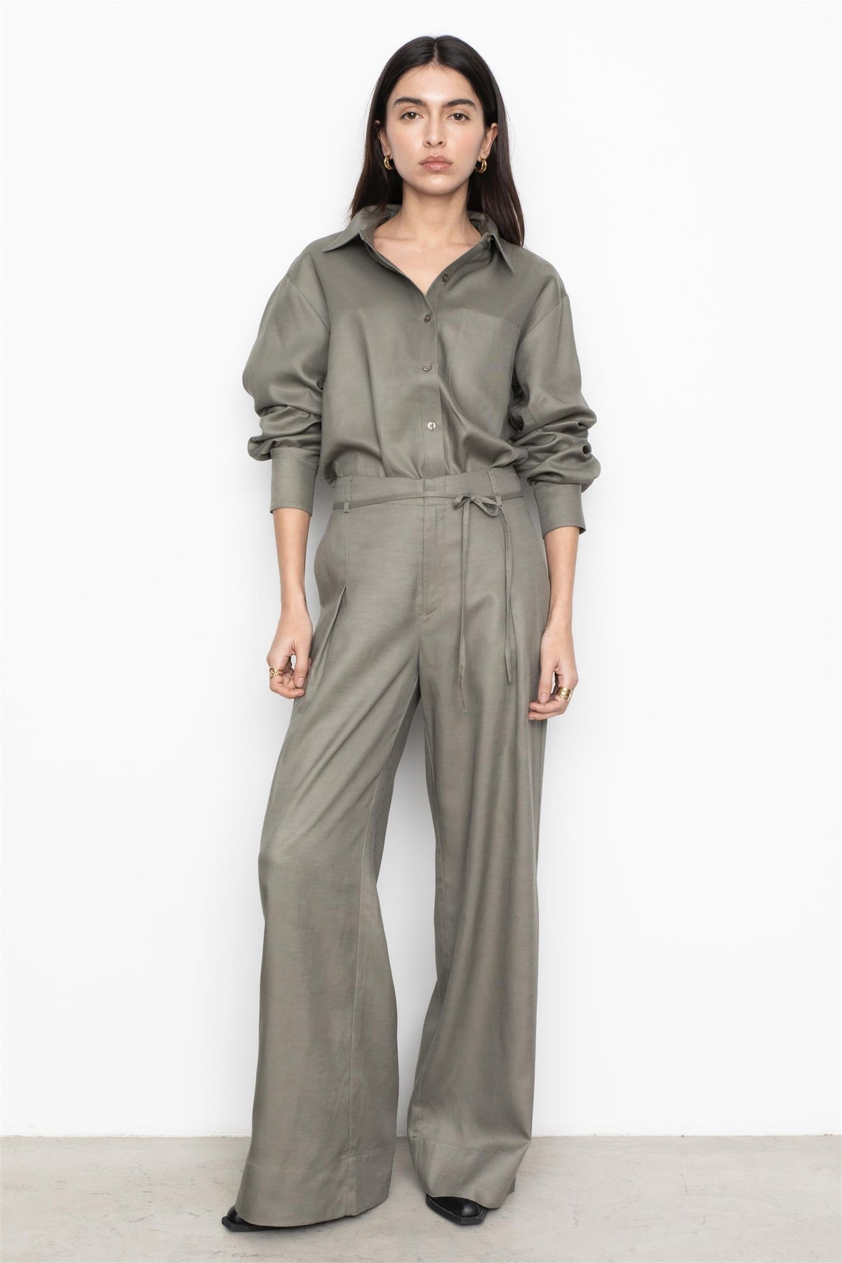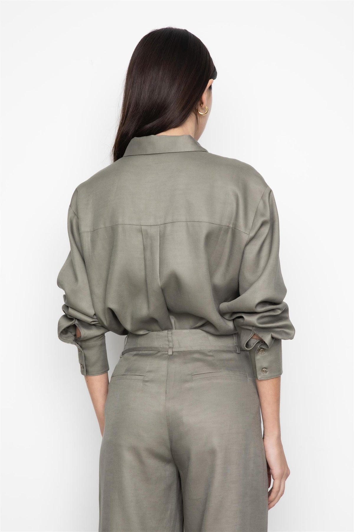 Denne oversized, luftige skjorten gir både en avslappet og sofistikert følelse. De senkede skuldrene og de delikate foldene ved erme-hullene og mansjettene gir skjorten et unikt og moderne uttrykk og den subtile brystlommen gir et lite hint av utility-inspirasjon og tilfører et praktisk, men stilig element til designet.