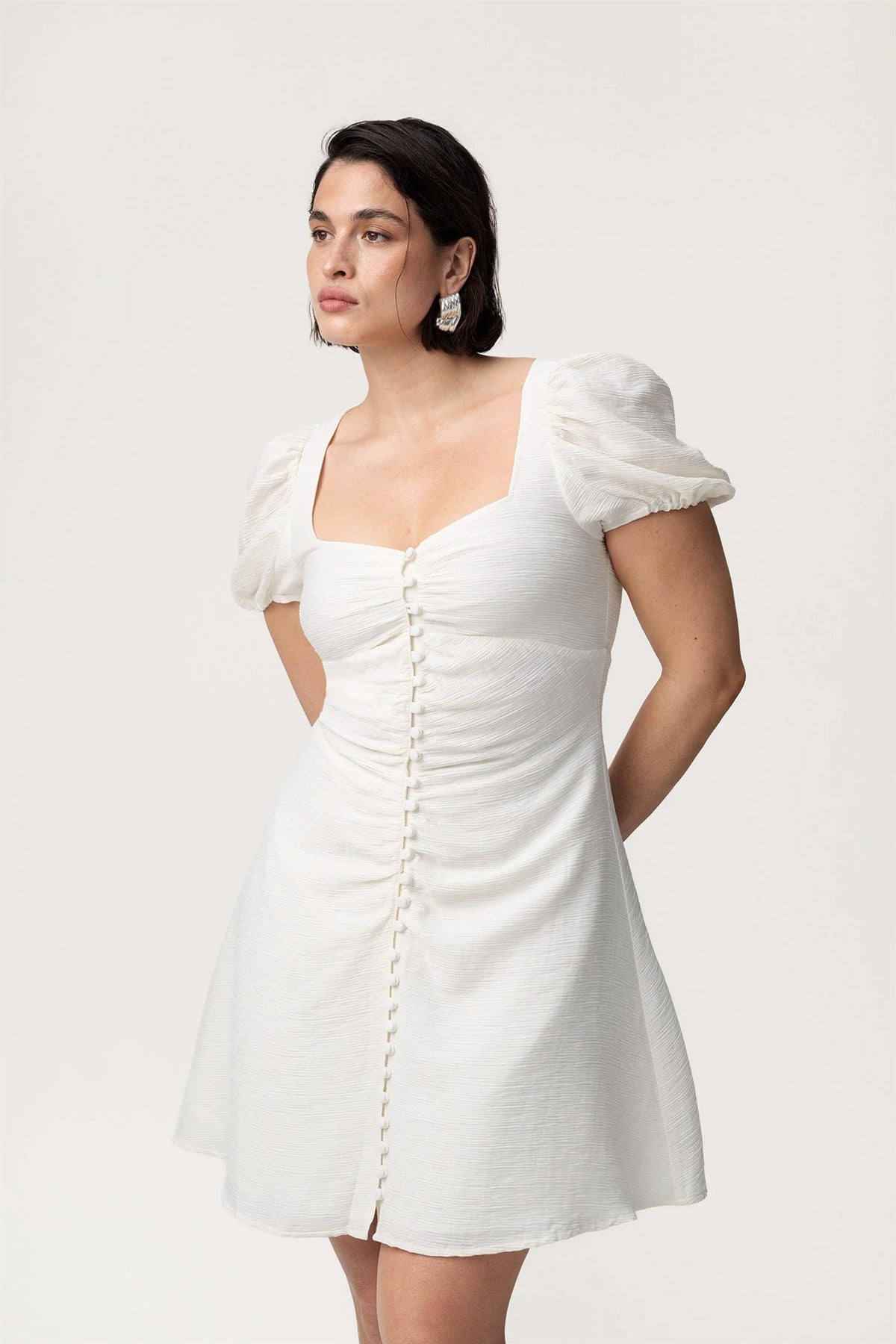 Kjolen har myke puffermer, rynket front og markert bysteparti som fremhever fasongen på en vakker måte. De dekorative knappene i front gir kjolen et sofistikert preg, mens det utsvingte skjørtet skaper en lett og flatterende passform. Skjult glidelås bak gjør kjolen enkel å ta av og på.