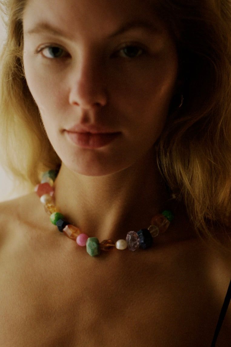 Dette armbåndet er designet med store, juveltonede steiner som balanserer dristighet og eleganse på perfekt vis. Hver stein har et naturlig, unikt snitt, noe som gjør at ingen armbånd er helt like og gir et personlig preg som gjør smykket helt unikt.