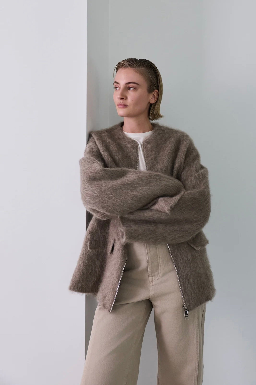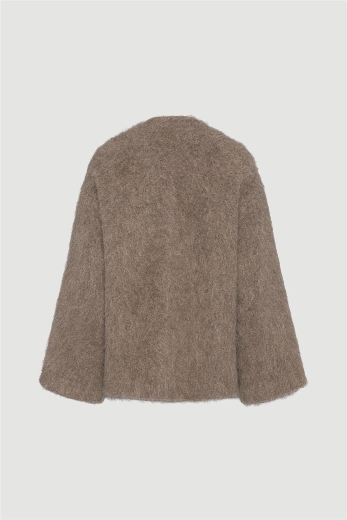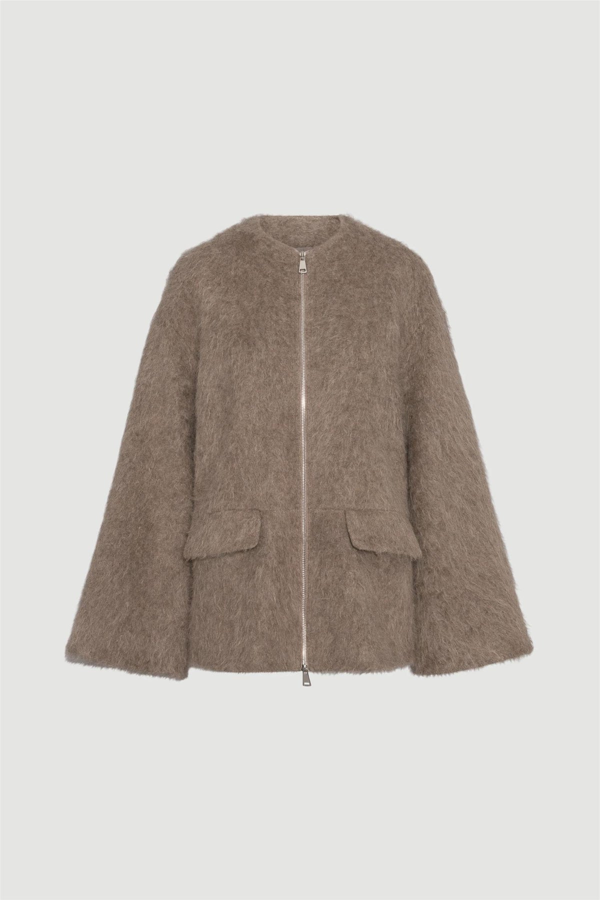 Jakken er laget i en lun, strukturert kvalitet som gir en behagelig og taktil følelse. Den krageløse halsen, de vide ermene og den rene glidelåslukkingen i front skaper en avslappet, men sofistikert silhuett. Diskré frontlommer fullfører designet og gjør jakken like praktisk som den er stilren.