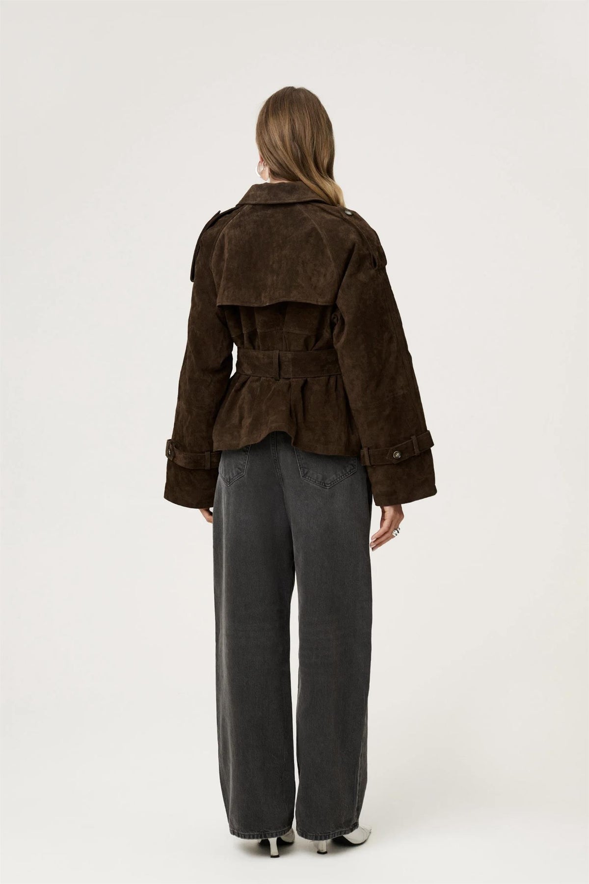 York Cropped Trench Coat fra Adoore i mørkebrunt semsket skinn er en moderne tolkning av den klassiske trenchcoaten.