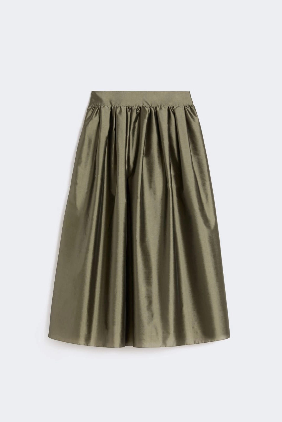 Skap et sofistikert og luftig uttrykk med dette lange organzaskjørtet i en elegant salviegrønn nyanse. De fine plisseringene gir skjørtet et vakkert volum og en lett, svevende bevegelse, perfekt til både festlige anledninger og stilfulle hverdagsantrekk.