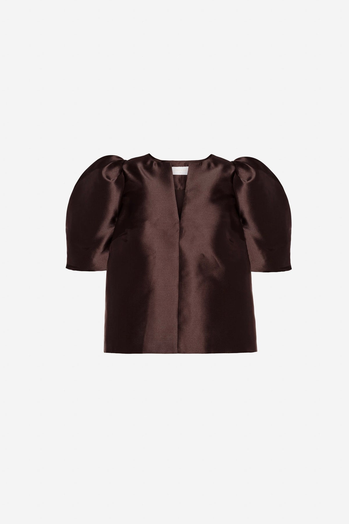 En løstsittende bluse med en smal v-hals og voluminøse ermer til rett over albuen.