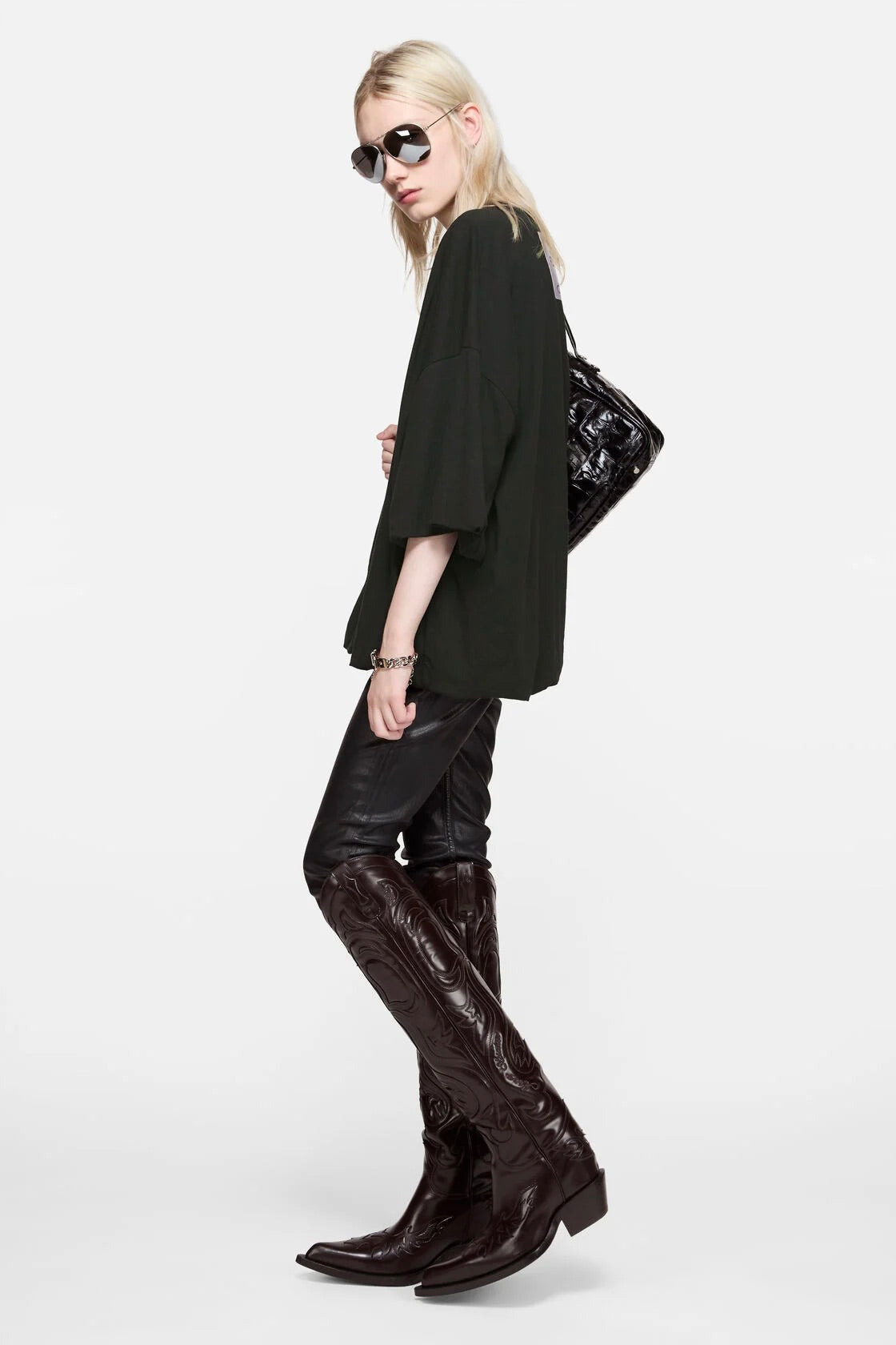 Med sin avslappede passform, senkede skuldre og lengde som går litt nedenfor hoften, kombinerer t-skjorten komfort og stil på en naturlig måte, perfekt til både jeans og skjørt for et uanstrengt, men gjennomført antrekk.