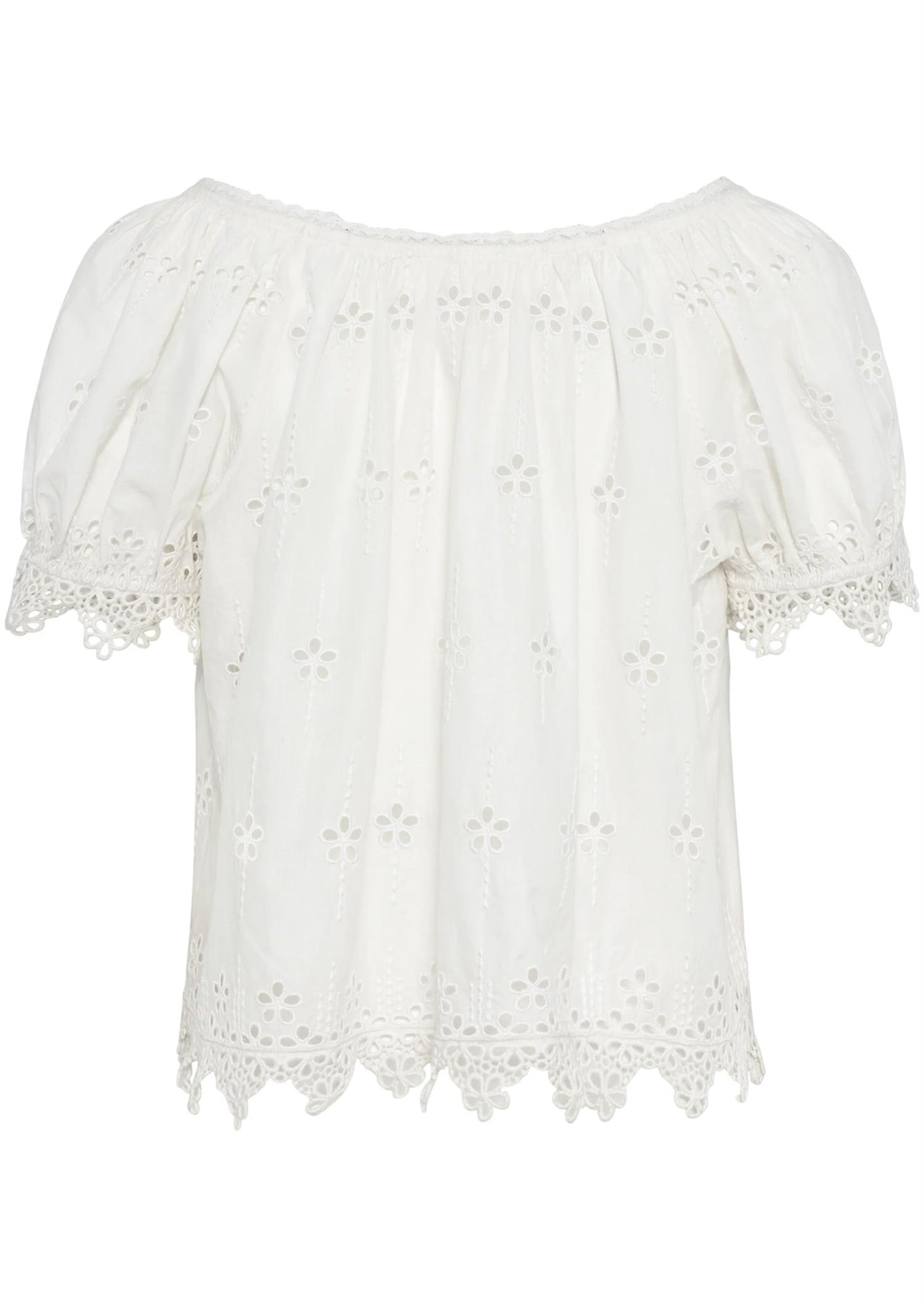 Fine broderidetaljer og subtile blondekanter tilfører et raffinert preg og løfter plagget. Blusen er laget i lett bomull som føles behagelig mot huden og gjør den ideell til både hverdagsbruk og mer pyntede sommeranledninger. Den er enkel å style, like fin til jeans som til skjørt eller dressbukser.