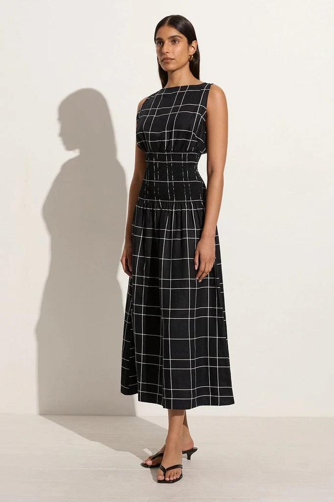 The La Canella Midi Dress from Faithfull the Brand is a sleeveless dress in a feminine silhouette with a boat neck and blouse bodice. The wide, fitted waist is gathered for extra stretch. Also giving the dress a flowy, A-line skirt that falls to a midi length. The dress is hand-printed with a contrasting white check and fully lined.