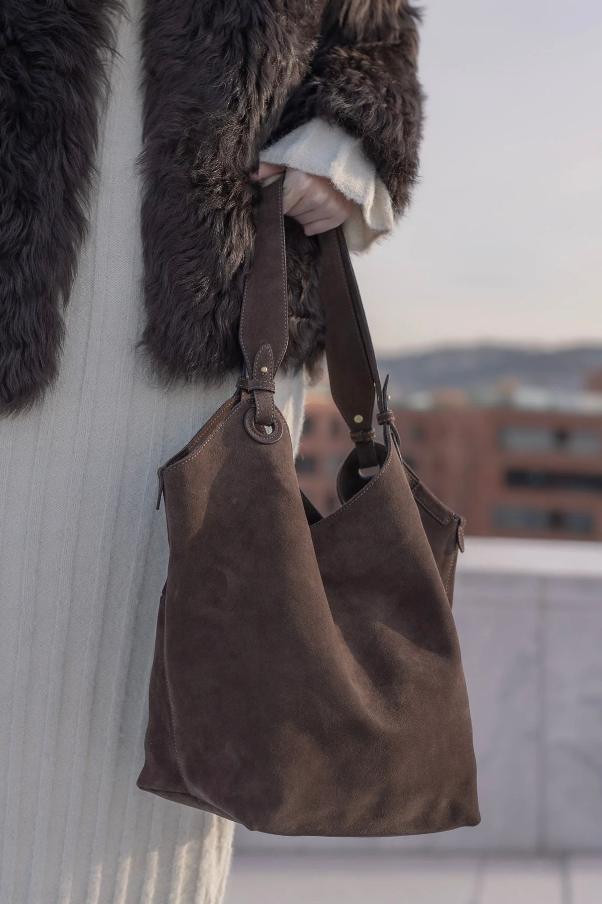 Soho Hobo Umber Suede fra Cala & Jade er en myk hobo-veske, laget av semsket kuskinn og gir et perfekt avslappet uttrykk.