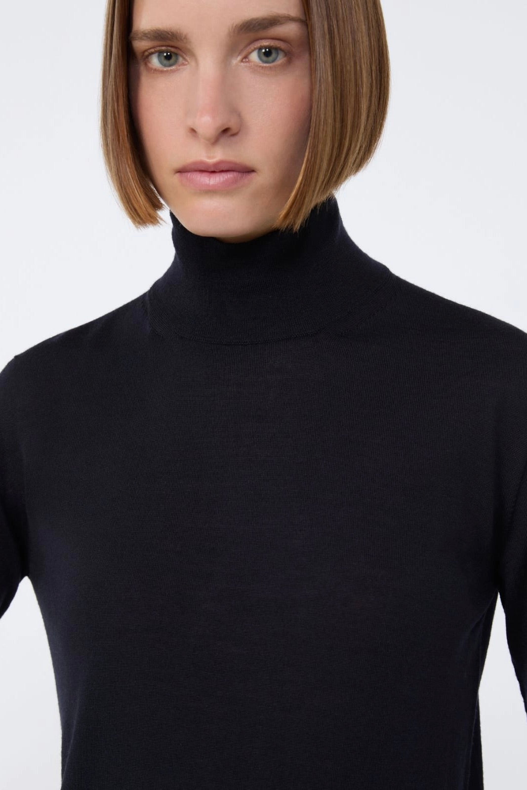 Den høye halsen gir både varme og et elegant preg, mens albuelange ermer og ribbestrikkede kanter i ermer og nederkant understreker kvaliteten og detaljfokuset.