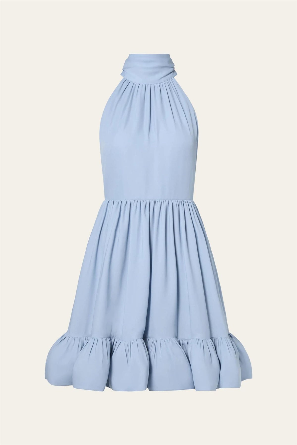 Fern Halterneck Ruffled Mini Dress fra Malina er en feminin og elegant sommerkjole med åpen rygg og halterneck-design.