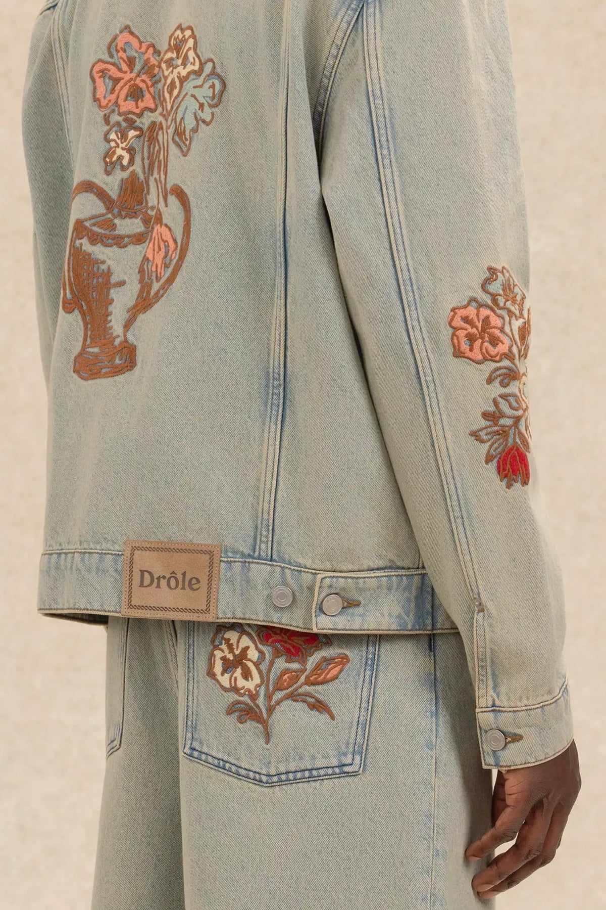 Veste Denim Dusty Brodée Fleurs fra Drôle de Monsieur: Denimjakke med blomsterbroderi og skinnpatch.
