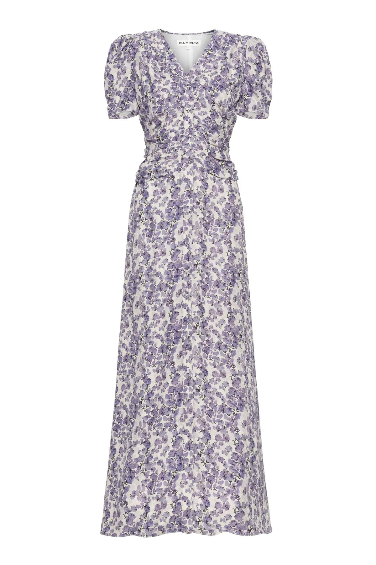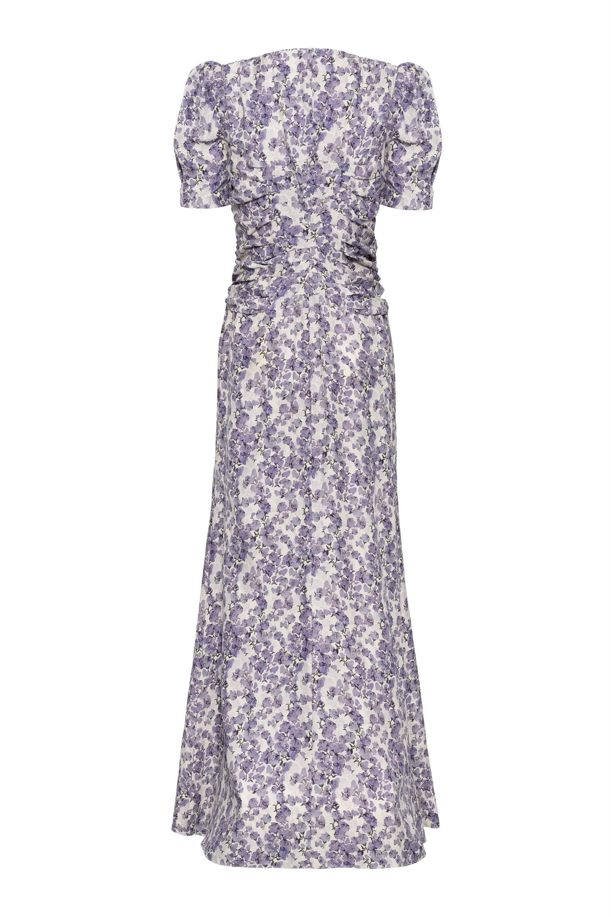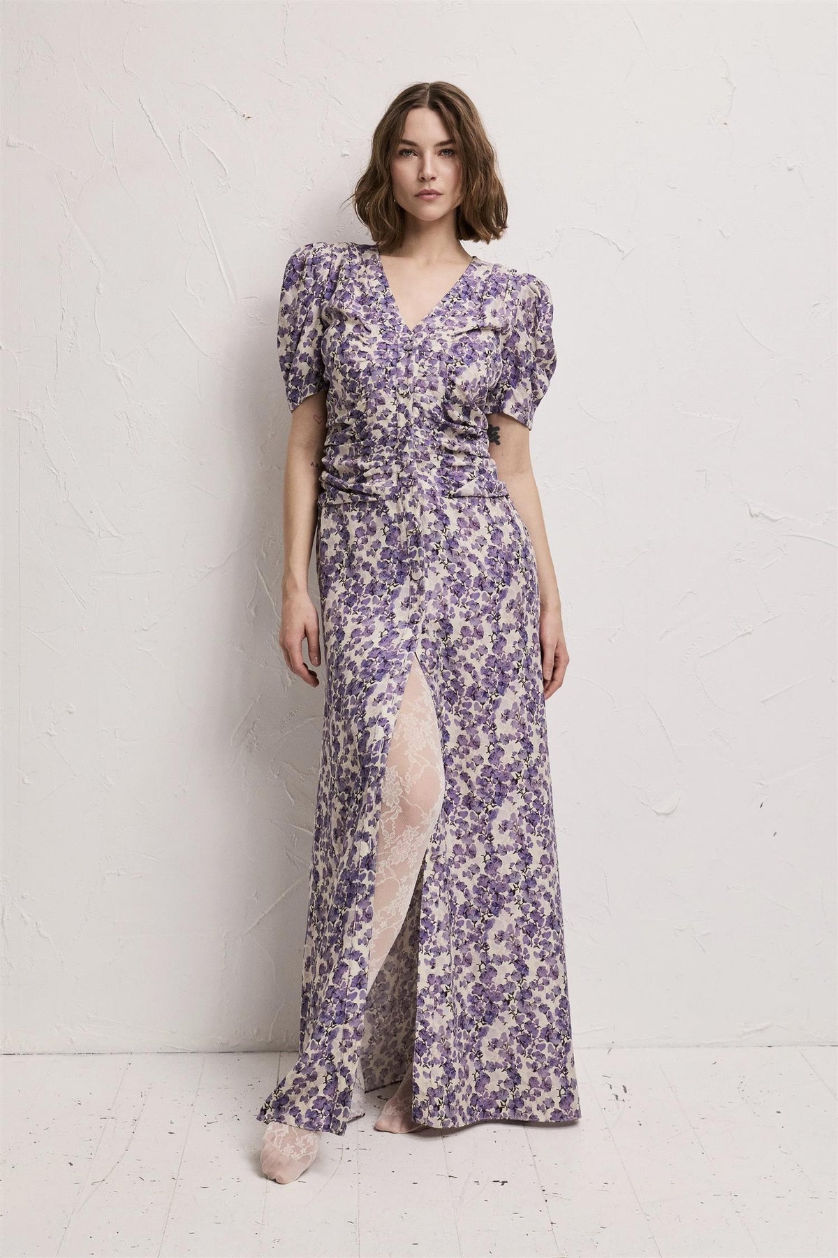 En lang blomstrete kjole i et mykt lavendelfarget print. Designet med dyp V-hals, korte puffermer og lette folder som faller naturlig gjennom midjen. Stoffet er lett og glatt med et mykt fall som beveger seg vakkert når du går.
