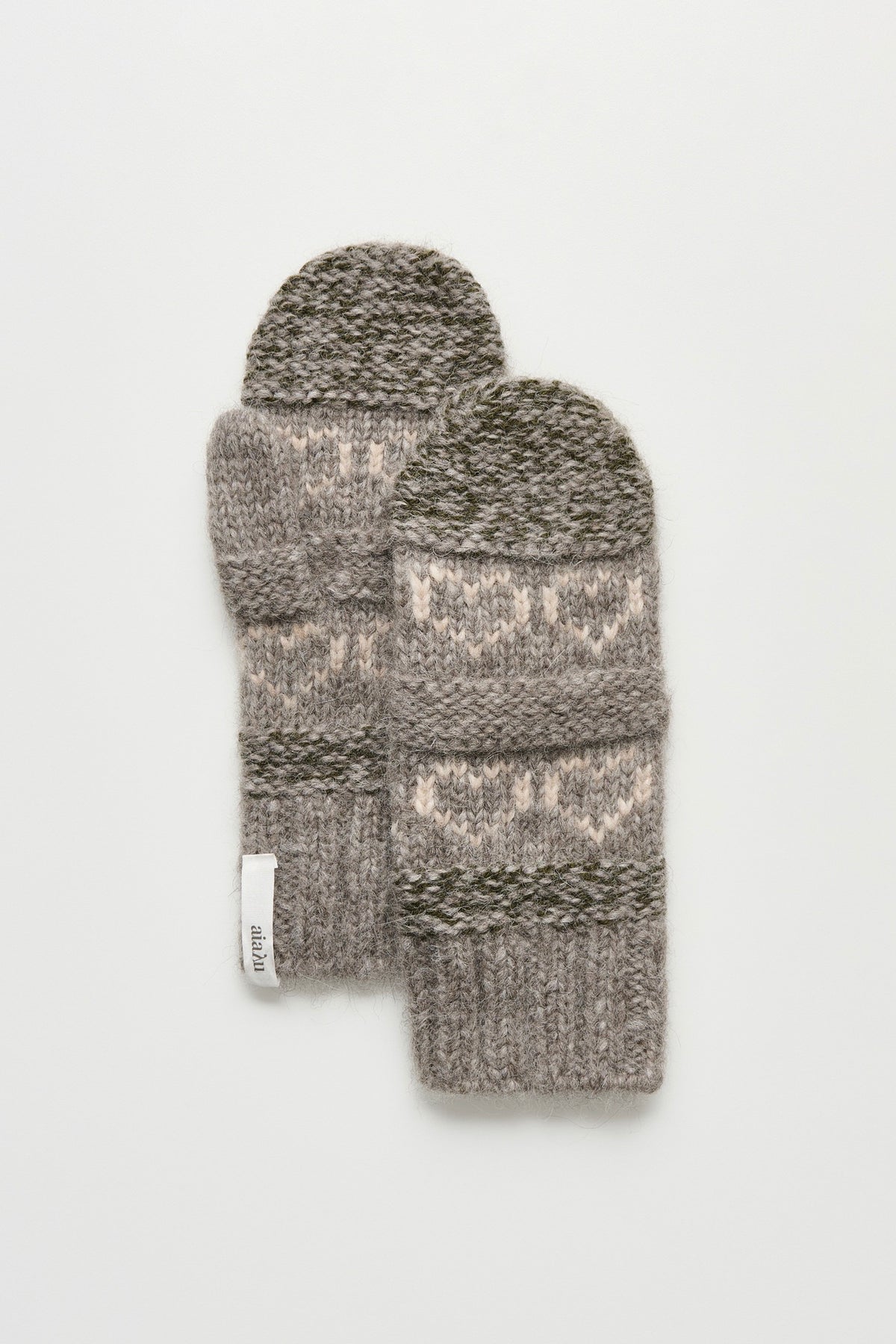 Et par myke, håndstrikkede votter i ubleket, melert lamaull med lett luftig tekstur. Vottene er designet med et søtt hjertemønster.