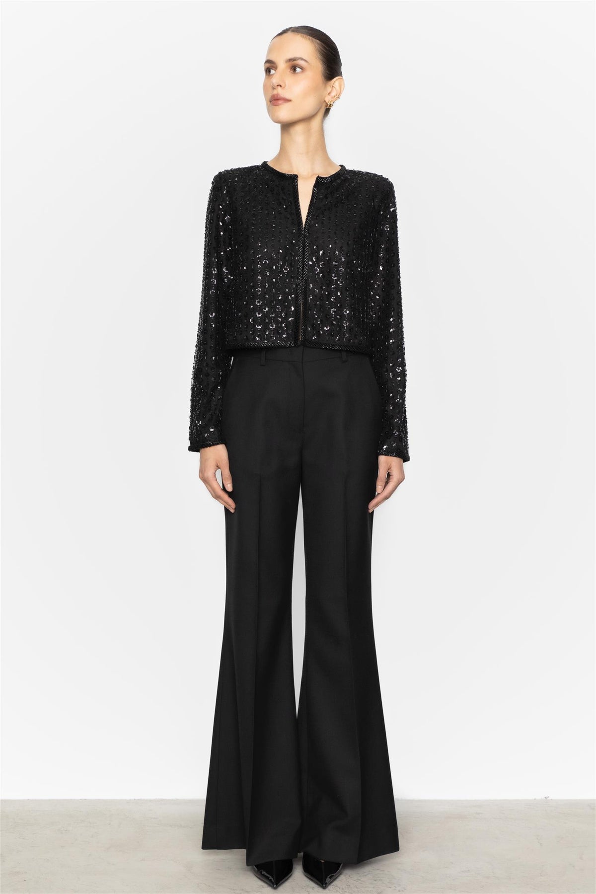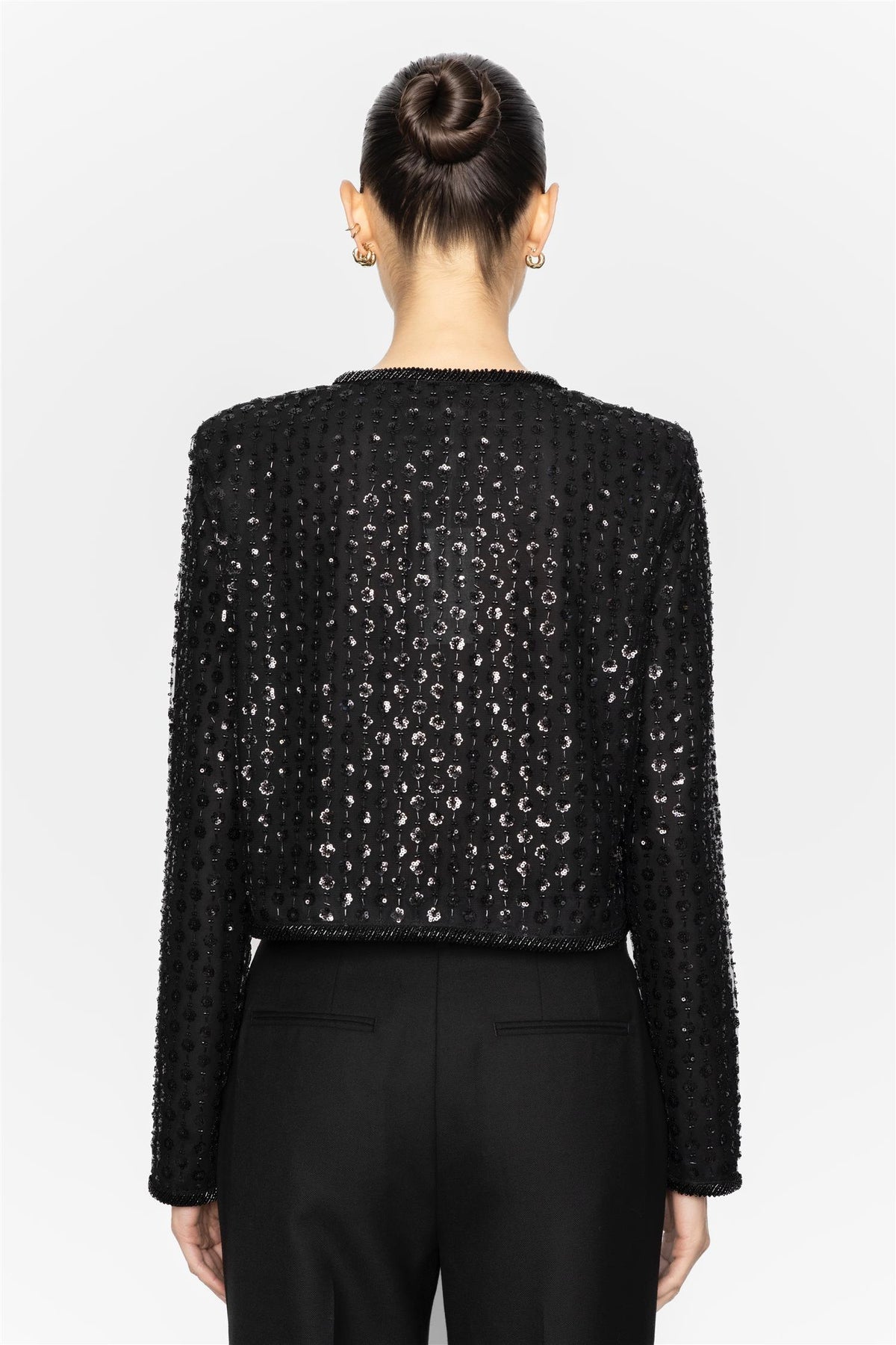 En kort jakke dekket av perler, med perlekant langs kantene for en elegant og glamorøs finish. Perfekt for å sette prikken over i-en på ethvert festantrekk.